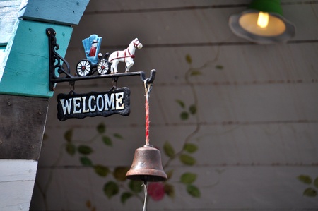 Welcome sign and bell in fresh morning