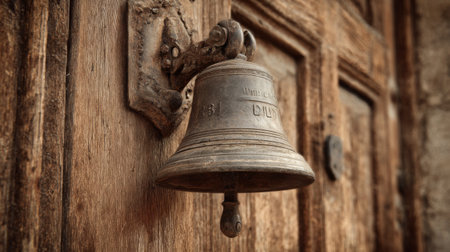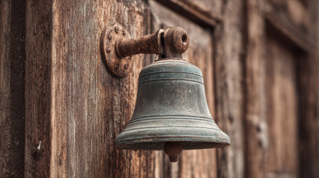 Close-up image of a vintage bell attached to a weathered wooden door, showcasing intricate iron hardware and evoking feelings of nostalgia and character in architecture.