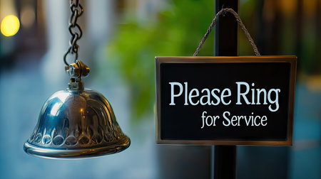 Close-up of service bell with a Please Ring for Service sign, emphasizing customer support and care.