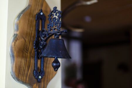 A closeup of a rustic bell on the wall