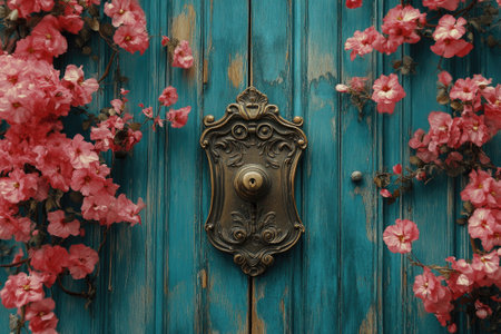 Close-up of pink flowers adorning a turquoise wooden door with an antique, ornate doorbell