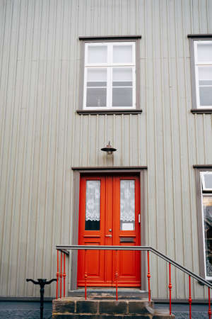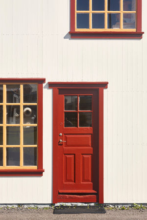 Picturesque white wooden facade with red window. Iceland traditional architecture