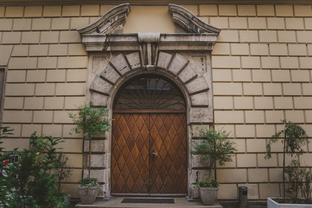 Amazing big old arched two-leaf wooden door with a mosaic window under a semicircular arch of stone. trees and bushes in pots at the entrance to the ancient building with stone wall in Krakow.