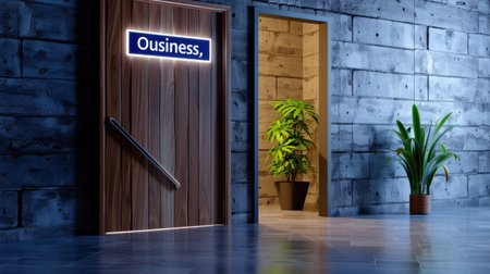 This image features a sleek wooden doorway leading to a cozy interior with a vibrant green plant, showcasing a modern office atmosphere filled with tranquility.