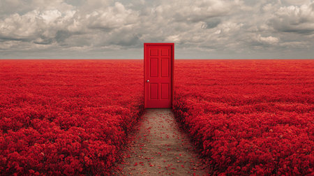 A red door appears alone in a field of poppies stretching far in all directions, with gray clouds overhead.