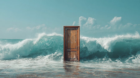 A door is placed in the ocean with waves crashing around it and the sky is clear and bright.