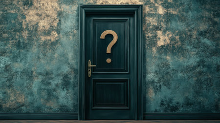 A captivating image of a mysterious door featuring a question mark, set against a textured dark wall, inviting contemplation and exploration of the unknown.
