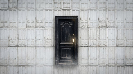Ornate black door set in a grid of white doors, emitting faint light. Wallpaper background.