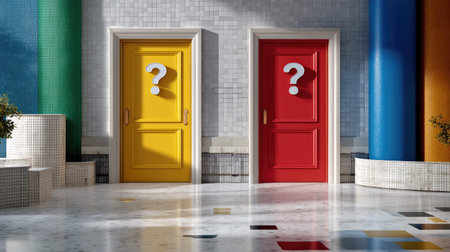 This visually striking image showcases two colorful doors marked with question marks, creating a sense of intrigue in a modern interior space that invites exploration.
