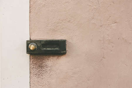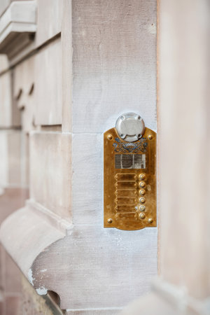 close up of an old rusty intercom embedded in weathered stone wall, blending technology with traditional architecture