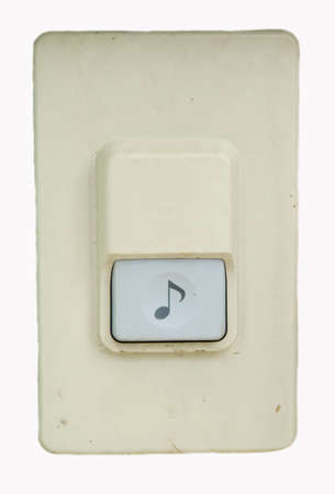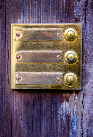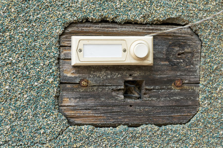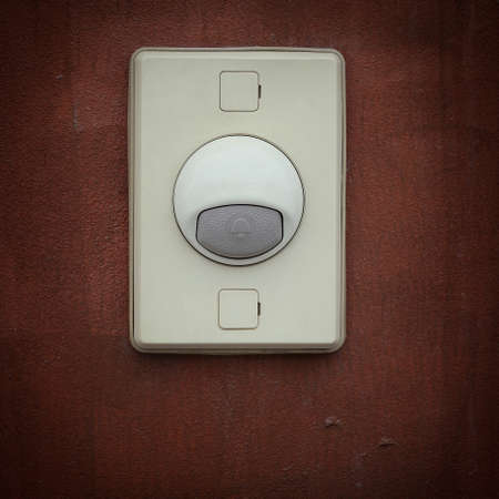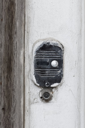 Close up on a filthy old electric doorbell fitting on a wooden door with bell icon on the button. This is a lighter version, a darker version is also available in the portfolio