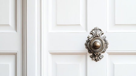 Overhead shot of a closed door with intricate handle, ample copy space on a clean background