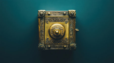 This image showcases an ornate vintage safe featuring intricate designs and a brass finish, perfectly juxtaposed against a deep blue background.