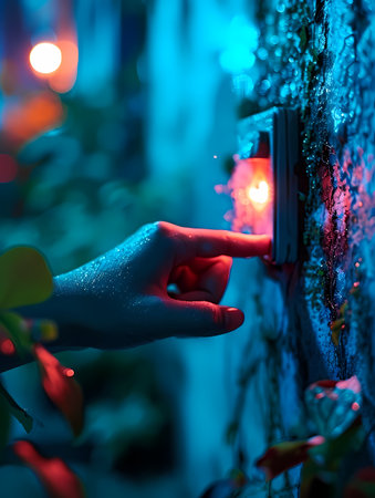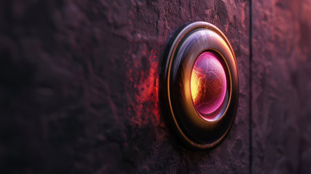 Close up view of decorative button embedded in textured wall, featuring glowing, colorful orb at its center. warm light creates inviting atmosphere, enhancing visual appeal of design