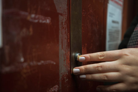 Fingers of a woman's hand on the elevator call button. Details of an old metal button on a red metal wall.
