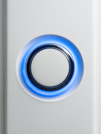 A minimalist white gadget featuring a radiant blue-lit circular button, emphasizing streamlined design and intuitive interface for cutting-edge electronic devices.