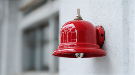 A charming vintage red bell mounted on a white wall, set against a soft-focus background. This alert symbol captures attention with its vibrant hue and retro appeal.
