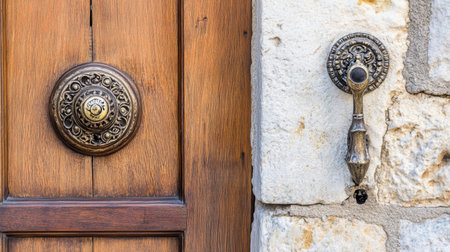 Captivating closeup of decorative door handles on a wooden wall, showcasing intricate design elements and rustic charm, perfect for home decor inspiration.
