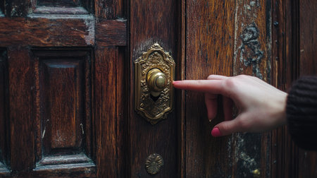 A hand gently touches a vintage doorbell on a beautifully aged wooden door, showcasing the intricate details and warmth of a cozy urban entrance.