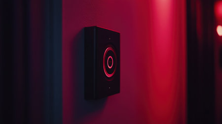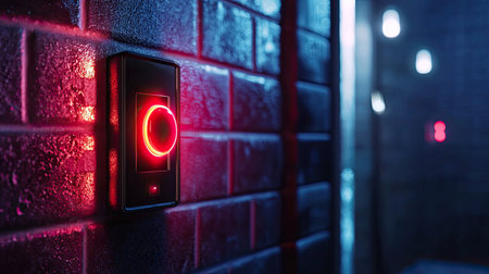 A striking illuminated red button stands out on a dark brick wall, surrounded by modern ambient lighting, creating a visually captivating interior scene.