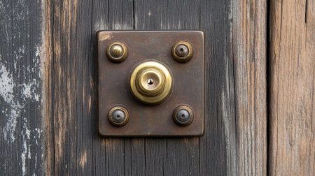 A detailed close-up of a rustic door lock set against weathered wooden planks, showcasing natural textures and colors that capture the essence of vintage design in natural light.