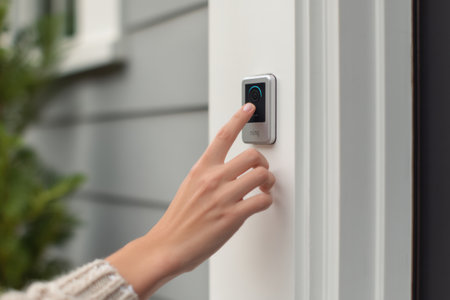 Hand is pushing a sleek doorbell scanner embedded in a clean entryway of a home, indicating someone is waiting to enter.