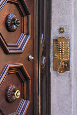 Old interphone in an ancient wooden door