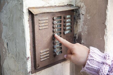 Close up the female hand presses the doorphone button. The girl is calling the intercom. Means of communication or notification of arrival and security of the entrance inside.