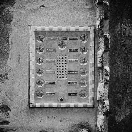 Retro intercom at building entrance. Selective focus on nameplate with Europa Club inscription in centre of image. May, 2013. Pisa, Italy.