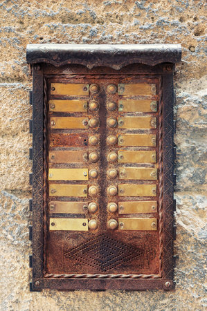Close-ups of building facades in Venice, Italy. An old vintage intercom and a mailbox on stone wall. On door where placed this old rusty doorbells.