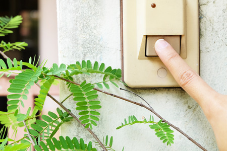 Hands of woman pressing ring the bell front home her friend in village or send delivery order to customer parcel product concept.