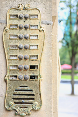 Old intercom in a house, detail of a electric apparatus in the facade of a building