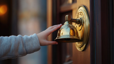 A hand gently touches a vintage doorbell on a beautifully aged wooden door, showcasing the intricate details and warmth of a cozy urban entrance.