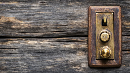 A close-up view of a vintage brass doorbell button set against a rustic wooden background, showcasing its intricate details and timeless charm, ideal for design inspiration.