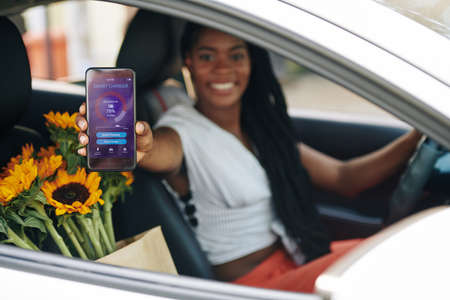 Happy female driver and passenger looking at the GPS on the mobile app on the smartphone while driving to a destination