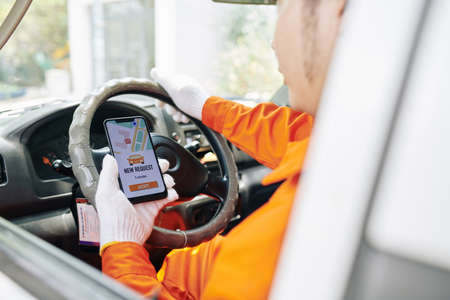 Man using mobile phone for gps tracking in car trip, close up of man using everyday technology
