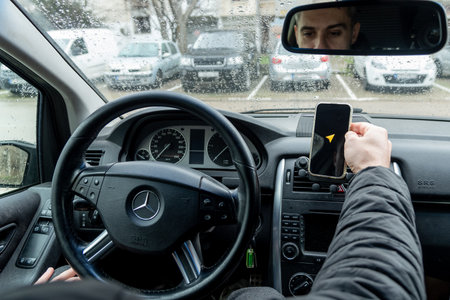 Driving and using waze maps application on smartphone on car dashboard, Driver using Waze maps app in Bucharest, Romania, 2021