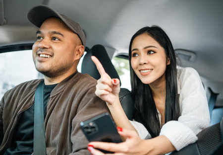 Young asian woman traveler talking with taxi driver explain the route how to travel in direction destination. Passenger showing the direction to taxi driver travel in city. Driver application service