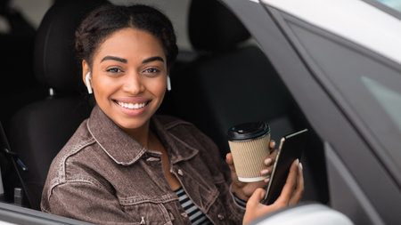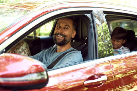 Young man driving a car with a smiling expression, showcasing a relaxed atmosphere The scene features a soft focus background