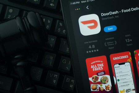 Dhaka, Bangladesh- 28 Oct 2025: An iPad displaying the DoorDash app against a judge's gavel and dark keyboard background.