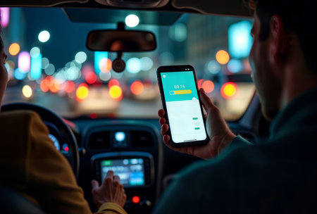 Night drive with smartphone. A person in the passenger seat holds a smartphone displaying a timer while another person drives through a city at night with blurred lights in the background.
