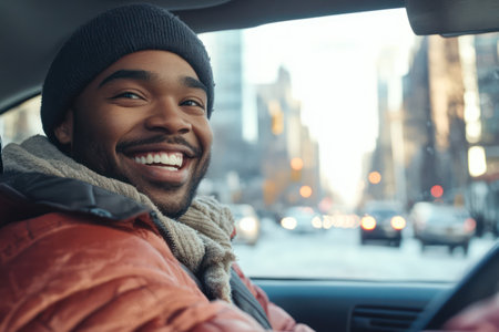 Happy man drives car through lively city streets, reflecting positivity, confidence, and the energy of urban life.