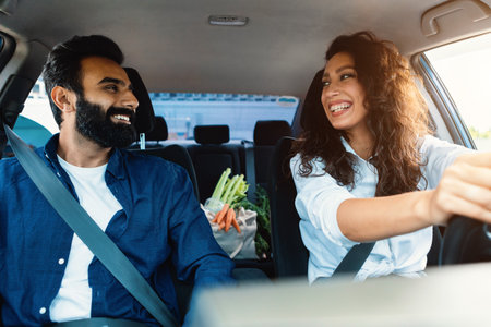 Happy arab couple driving home after shopping in supermarket, bag full of fresh vegetables on the back seat of car