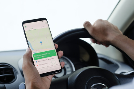 CHIANG MAI,THAILAND - August 26, 2018 : Samsung galaxy S8 Plus open grab application on man hands in car,Grab taxi Many Thailand people are attracted to join the ride sharing services business.