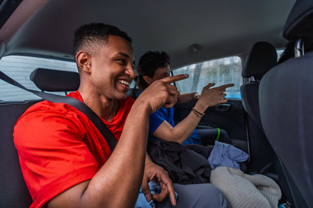 Young male pickleball players sharing a ride in a car, smiling and pointing while traveling together, expressing friendship, teamwork, and active lifestyle