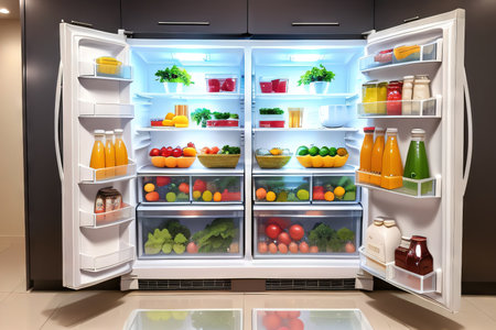 A sleek, modern refrigerator with its doors open, filled with fresh food and drinks, including eggs, juice, and vegetables, all organized on clean shelves.
