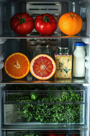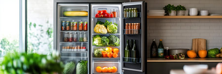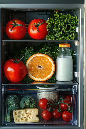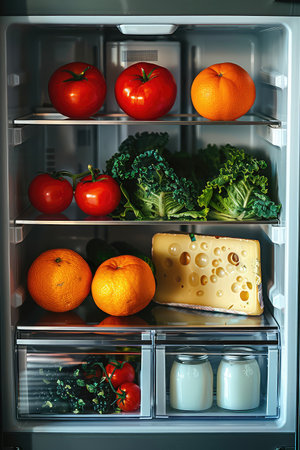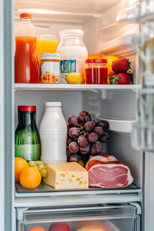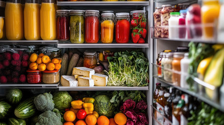 A well-stocked refrigerator displays a variety of fresh fruits, vegetables, and drinks, promoting a healthy lifestyle. Shelves showcase colorful produce and neatly arranged jars of preserves.