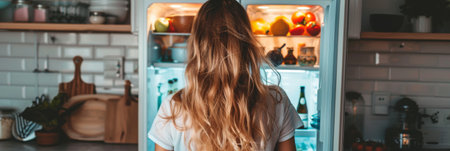 Open refrigerator, young woman near refrigerator in kitchen, diet, increased appetite, weight loss difficulties, woman looking to food back view, generative ai illustration