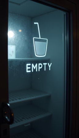 Empty refrigerator shelves visible through door with empty text and a drink icon
