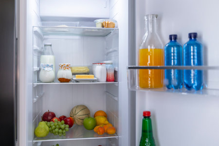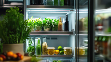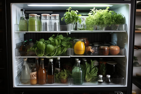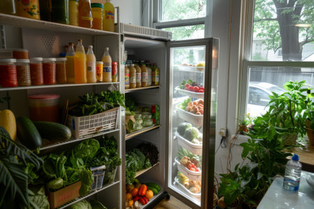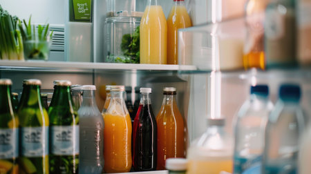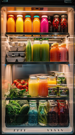 Fridge with Juices and Fresh Produce: healthy drinks, chilled beverages, storage ideas, lifestyle choices, wellness and nutrition focus